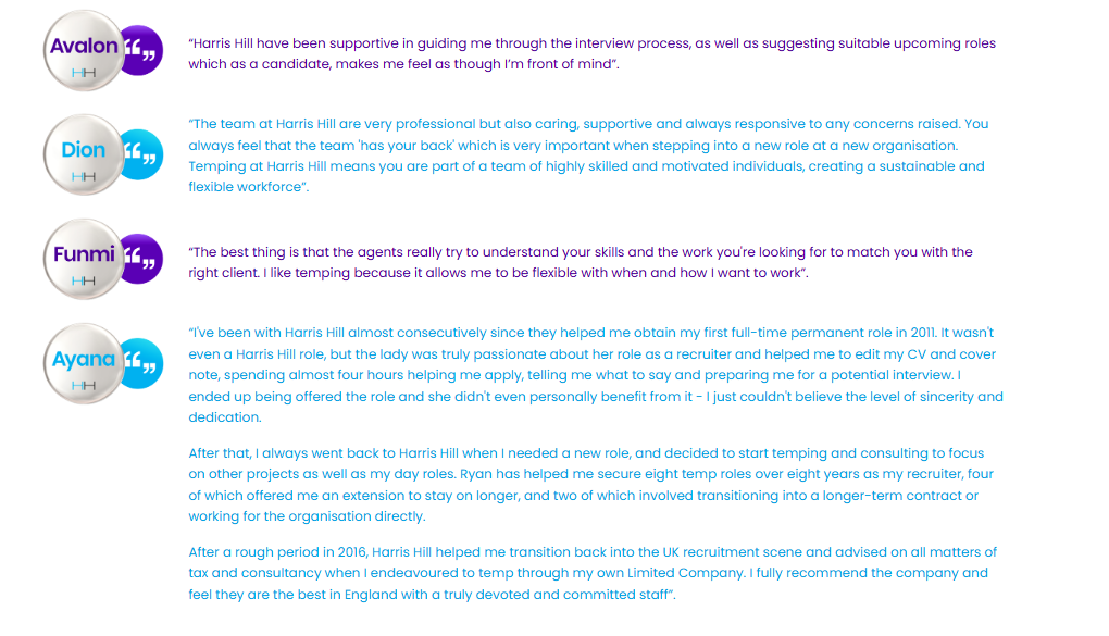“Temping in the UK was a bit of a mystery to me as it's never been required in my working life to date. I contacted Harris Hill through a friend who is currently temping, as I'd been for several interviews but hadn't secured a permanent role. I always had a perception that temps were there just to help companies who needed cover.”